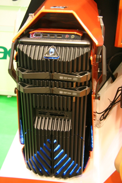 It also comes with a 24-inch 1920 x 1080 orange screen, G15 gaming laptop and G5 gaming mouse from Logitech. There are two bundles at the show – 3,999 and 5,999. The main difference in the 3,999 does not have Blu-ray, has only a single graphics (think it was 9800GTX) and uses normal Quad Core. The higher-end one uses dual 9800 GTX, Blu-ray and Intel Extreme procs.