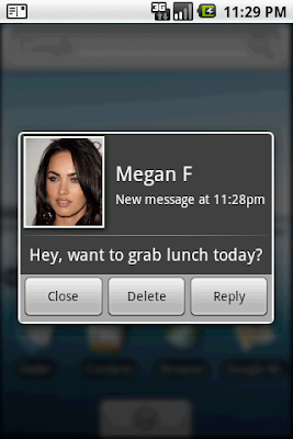 Or, if you are lazy like me, download an app like Handcent or SMS Popup (above), which will show up all your Contacts’ numbers in the “To” field. These nice apps also pop up a dialogue box for quick SMS reply when you get an incoming message.