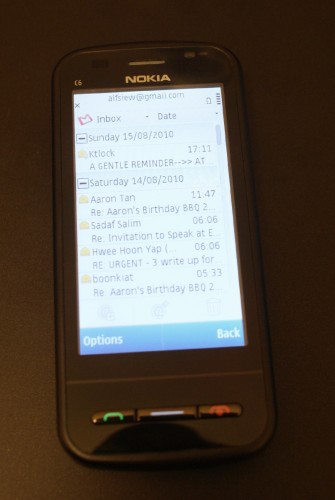 The only good thing I can say about the C6 is what I’ve said before about older Nokia phones – the easy e-mail setup. All I have to do to get my Gmail running on the device is to key in my e-mail address and password. The e-mail setup even has settings for SingNet mail, which many users in Singapore still use as an auxiliary inbox.