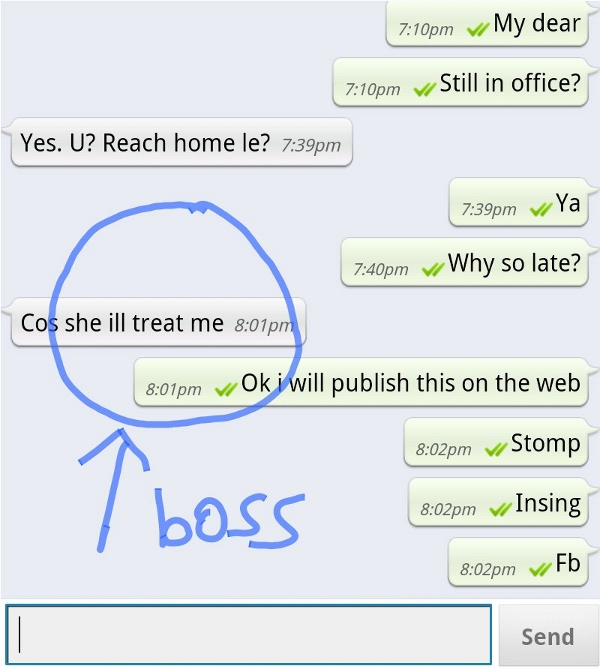 I was asking her one day about her work and she was again still stucked in office till quite late as her normal working hours is till 5:30pm. I feel bad and was telling me that she ill treat her (boss), so I decided to circle that sentence and was determined to let everyone know.