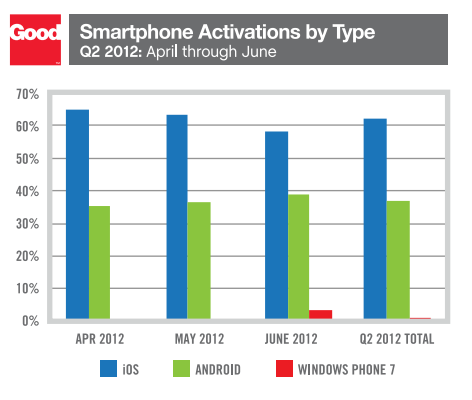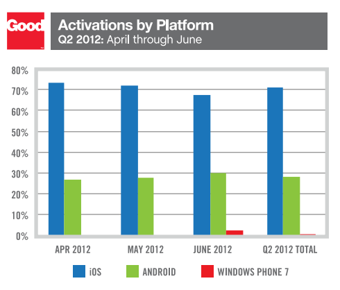 For the first time, Windows Phone activations were included in the report. While the devices only account for 1.2 percent of overall activations so far, Good Technology said this number may grow with the launch of Windows 8 and new Windows Phone devices.