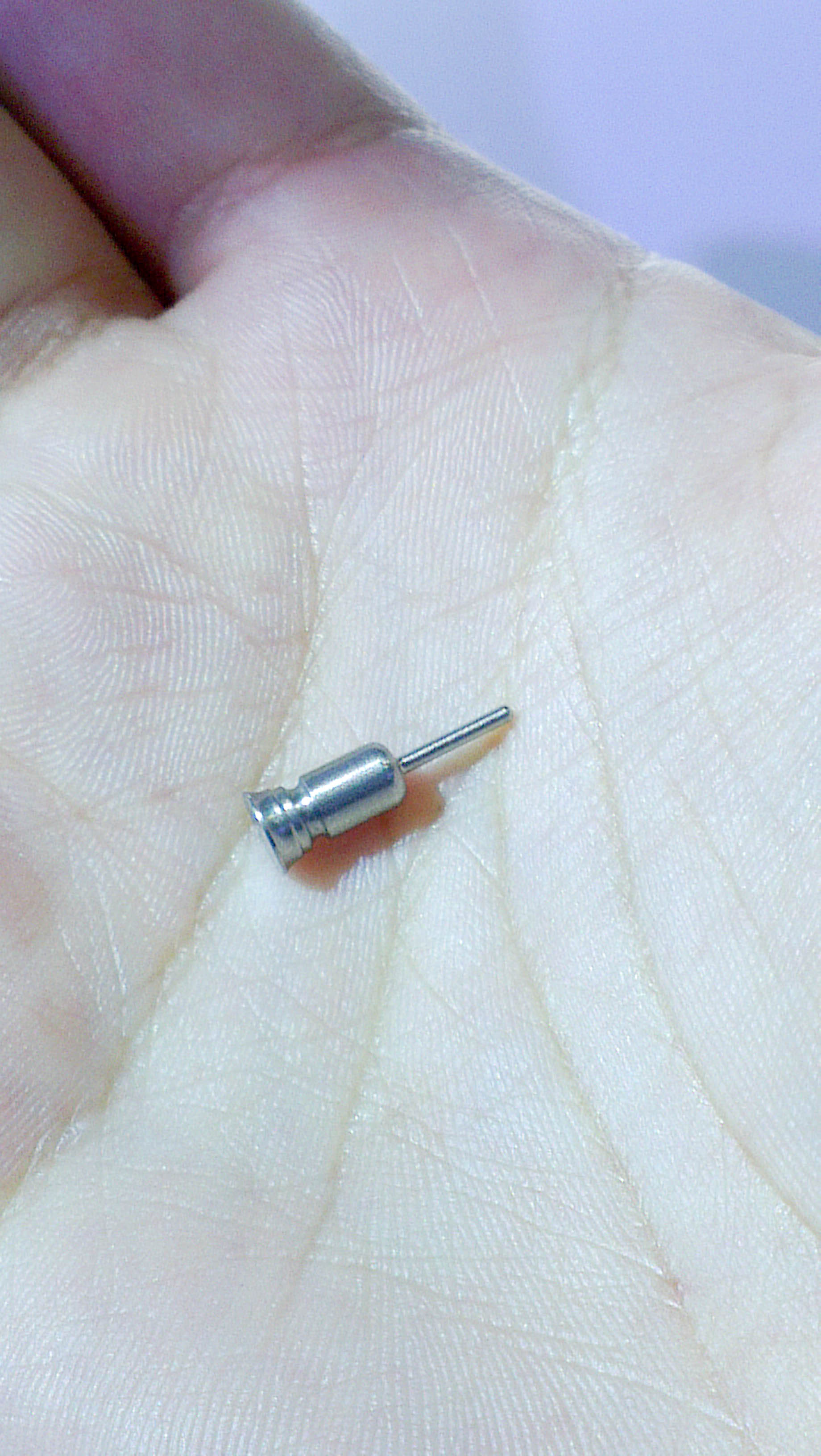 The headphone jack is also covered by a detachable metal plug. When removed, the metal plug looks remarkably like a thumbtack with its needle-like end.