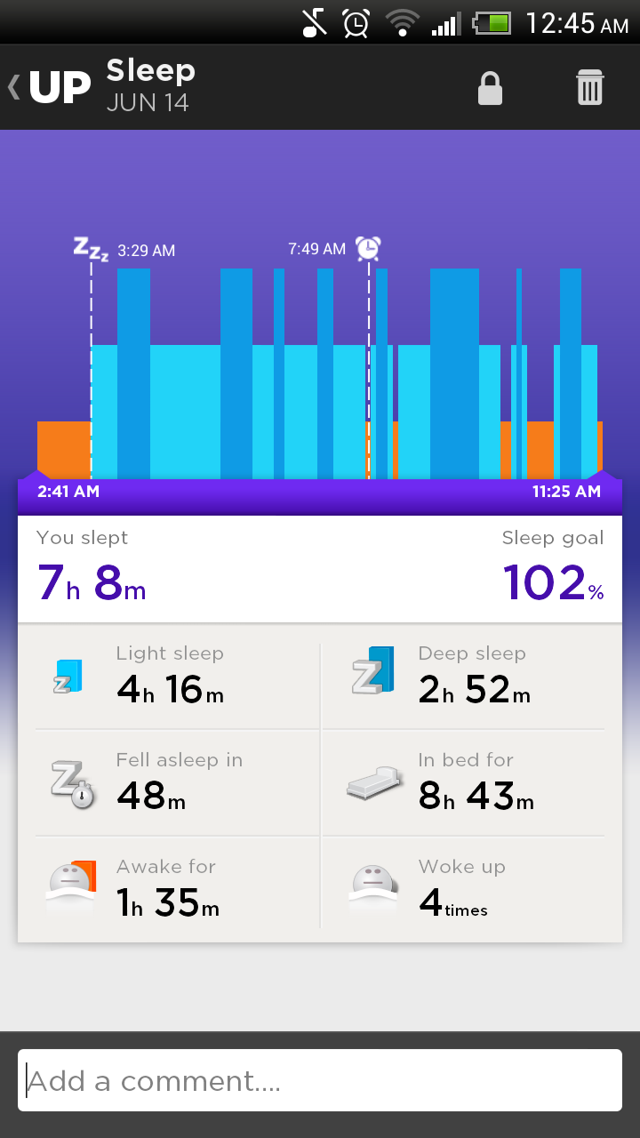 The UP tracks my deep and light sleep periods and the number of times I’ve woken up. It seems to be pretty accurate when tracking the number of times I’m awake so far. When I switch the UP into sleep mode, it also tracks the amount of time I take to fall asleep, which is pretty awesome.