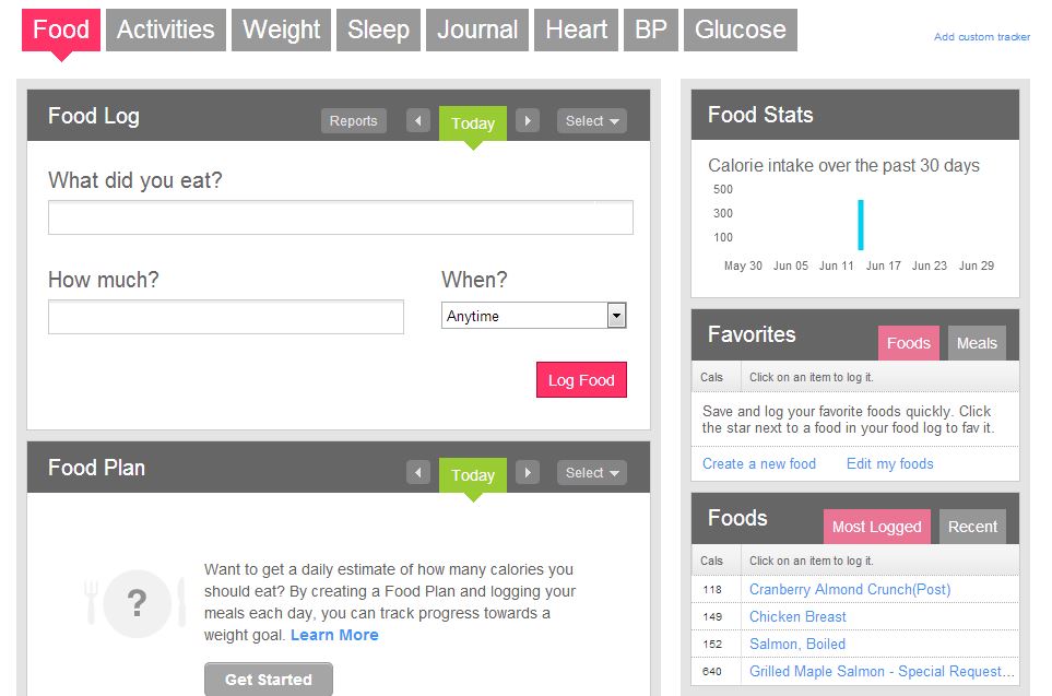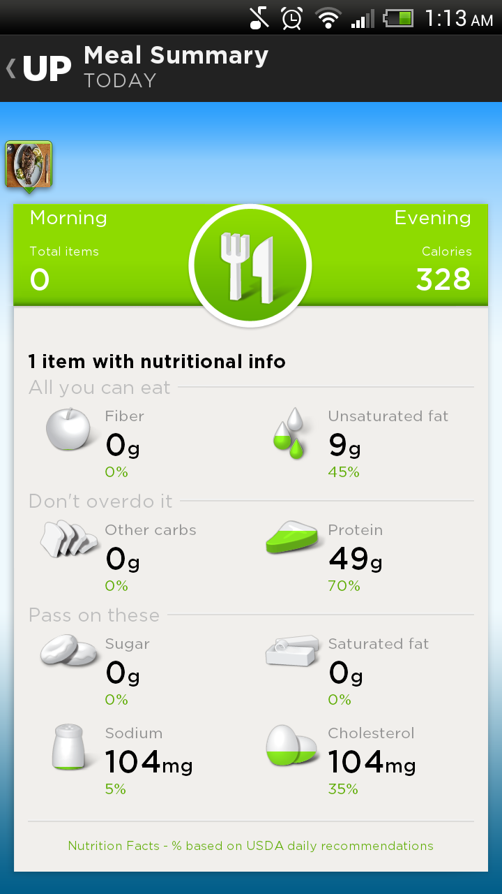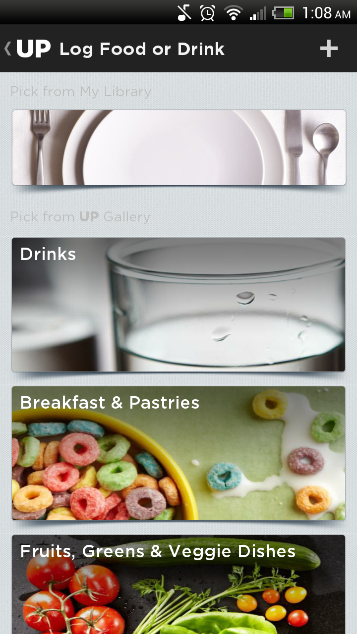 The food logging portion on the UP is also a pleasure to use, with stunning photographs and visuals and an easy logging method by narrowing down the database of food into broad categories like fish and cereal.
