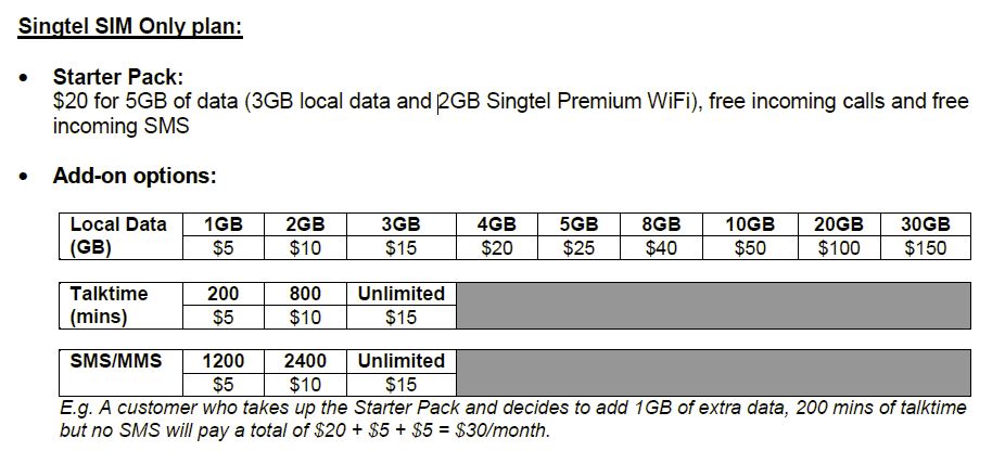 For S$20 a month, users get 3GB of mobile data (plus 2GB of Singtel Wi-Fi access) along with free incoming calls and incoming SMSes.