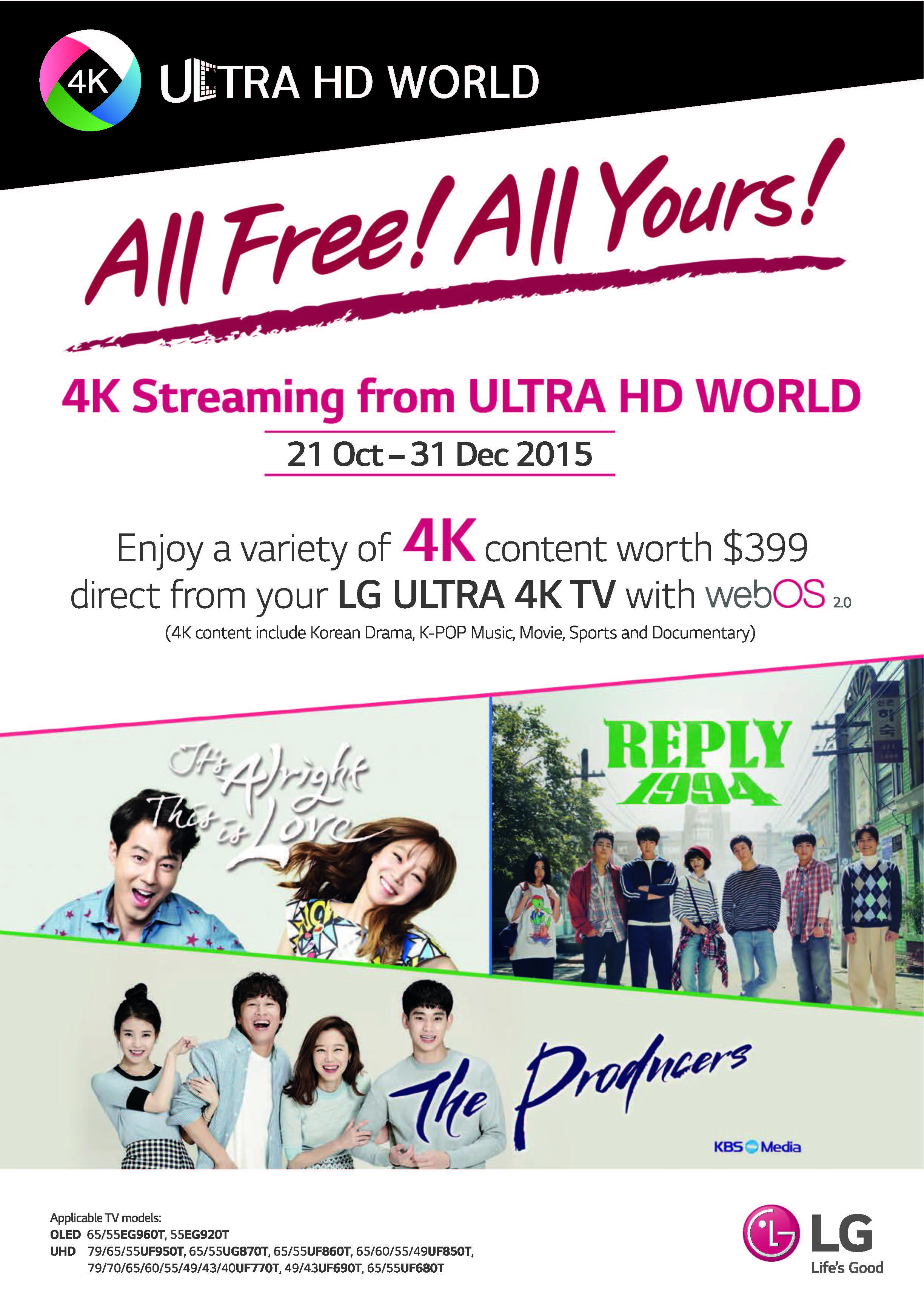 LG is streaming 4K content to its 4K TVs sold in Singapore. Until the end of this year, viewers of selected TVs can watch Korean shows such as The Producers and Reply 1994 straight on their TVs for free.