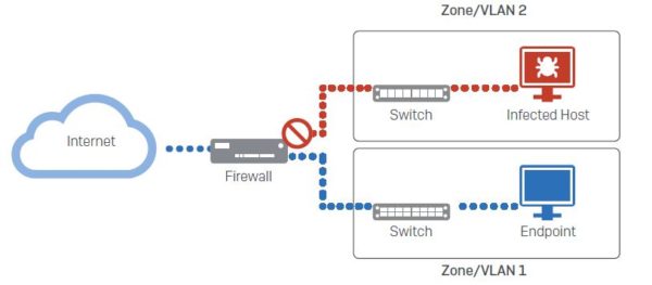 Unfortunately, many organisations operate with a flat network topology – with all their endpoints connected into a common switch fabric. This topology compromises protection by enabling easy lateral movement or propagation of network attacks within the Local Area Network since the firewall has no visibility or control over the traffic through the switch.