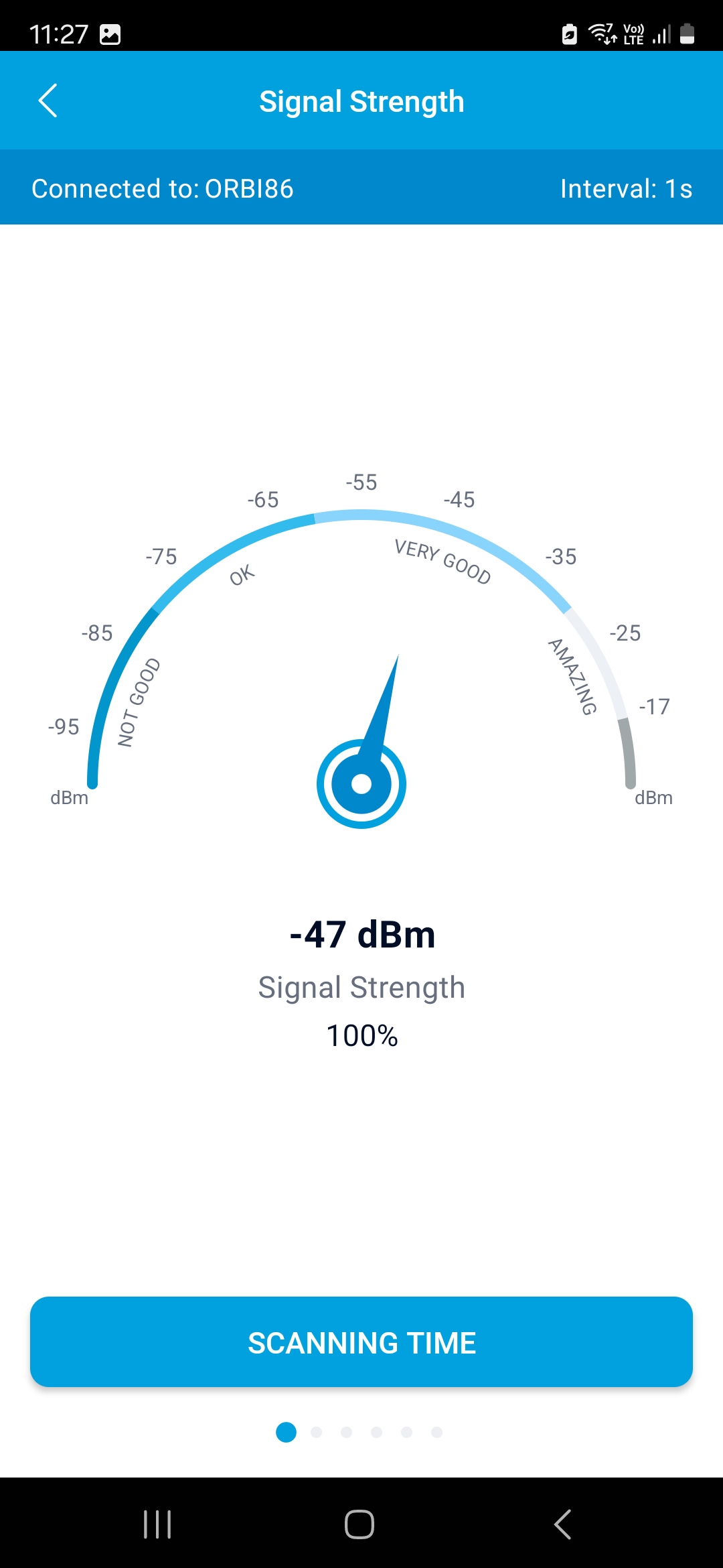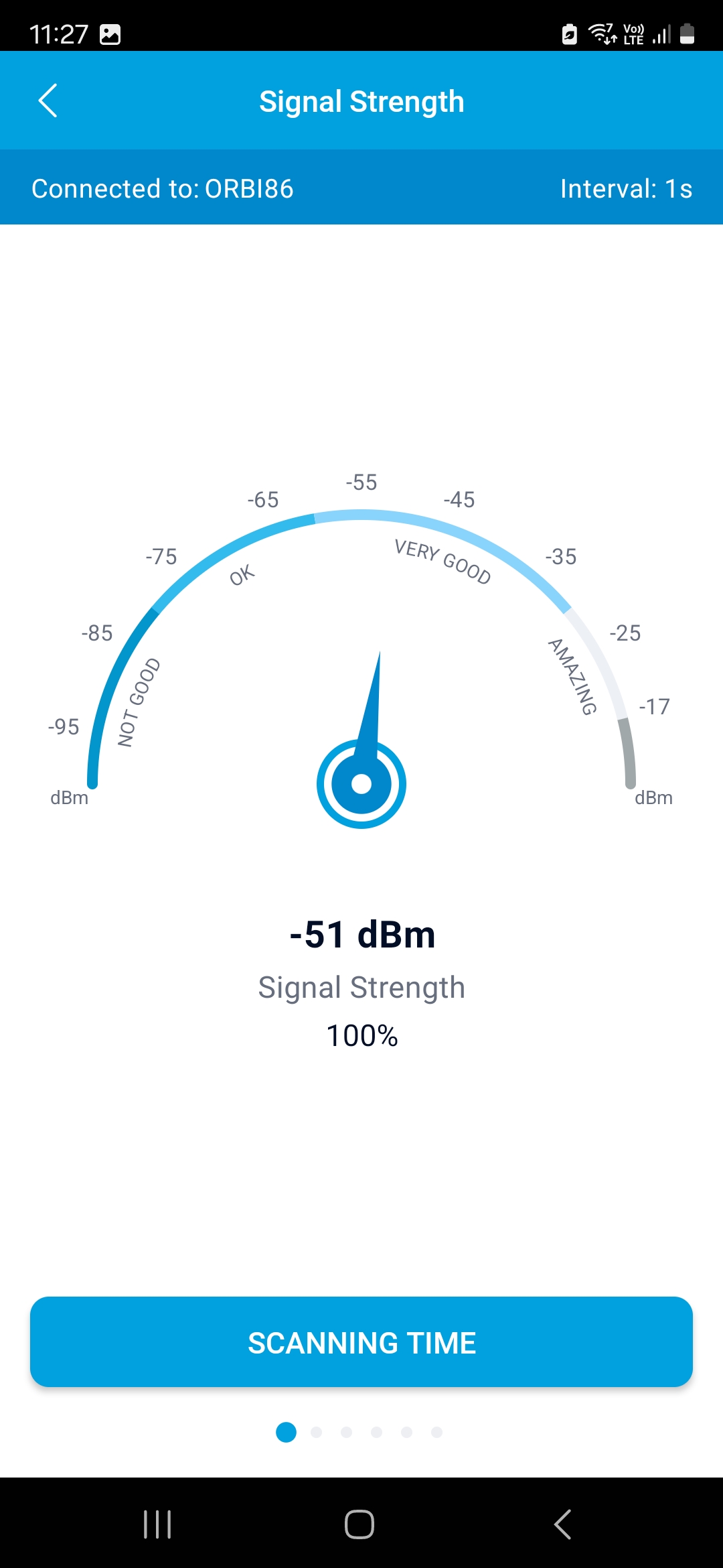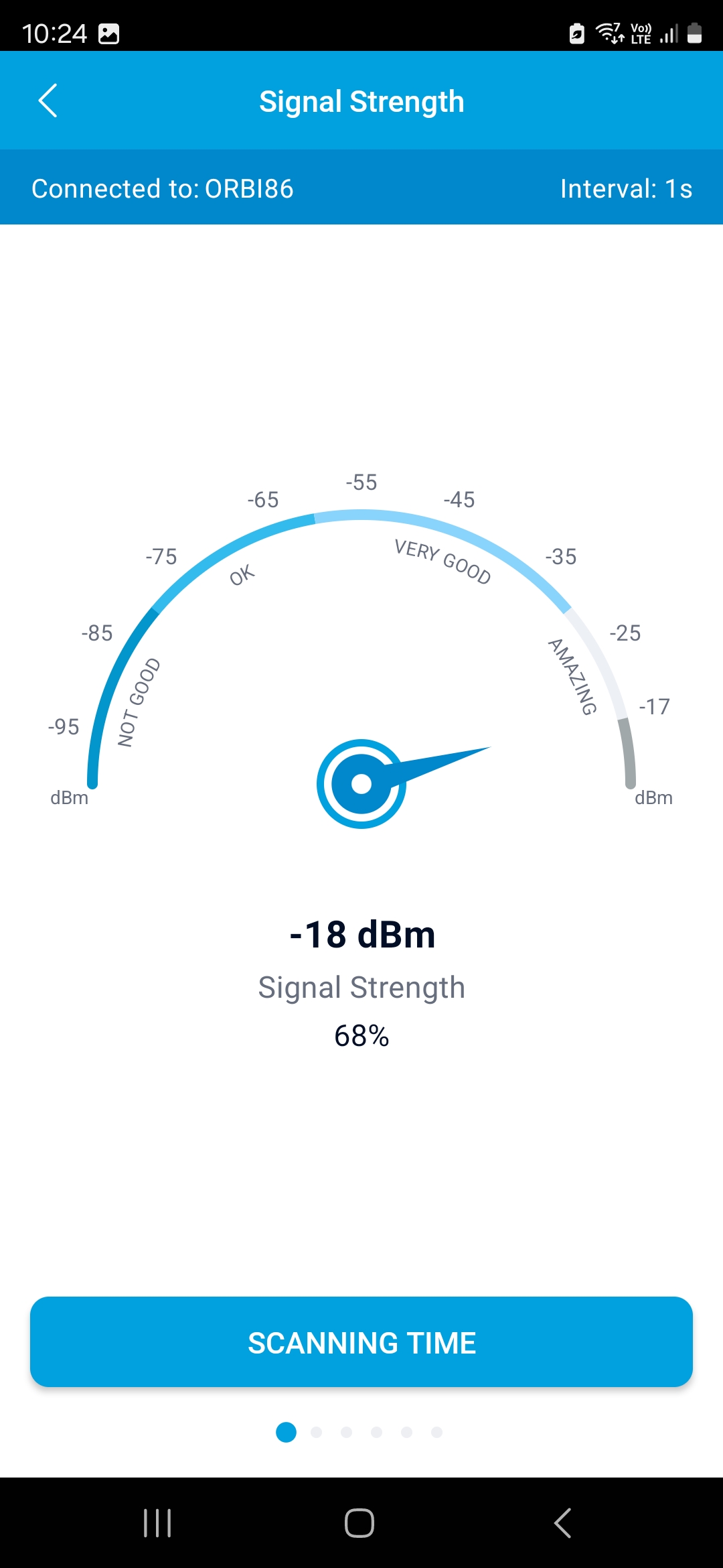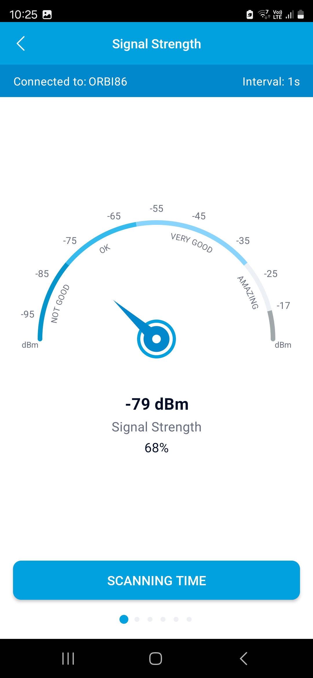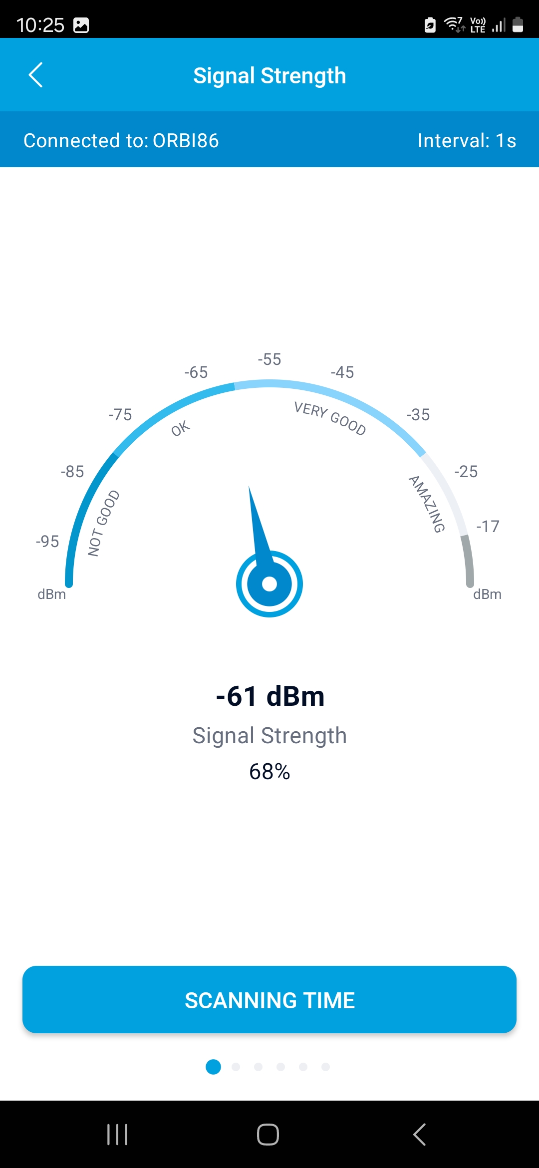 With one mesh running, signal strength is obviously great in front of the node, drops to the okay range at the master bedroom, and borderline when in the toilet.