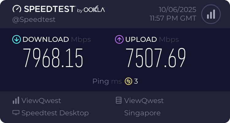 Connected to a 10Gbps network card using Marvell’s energy-efficient AQC113 chip, my desktop PC gets about 8Gbps downstream, similar to my router connecting directly to my Internet provider, ViewQwest. Upstream, the speeds are pretty similar as well.