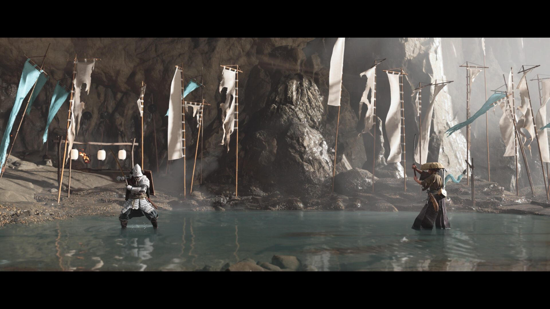 Ghost of Yōtei is clearly heavily influenced by samurai films and westerns in terms of the cinematography, shot composition and music. It shows off its cinematic flair with modes from influential directors like Akira Kurosawa, with a dramatic and harsh black and white filter; as well as Takashi Miike, with copious blood and mud effects.