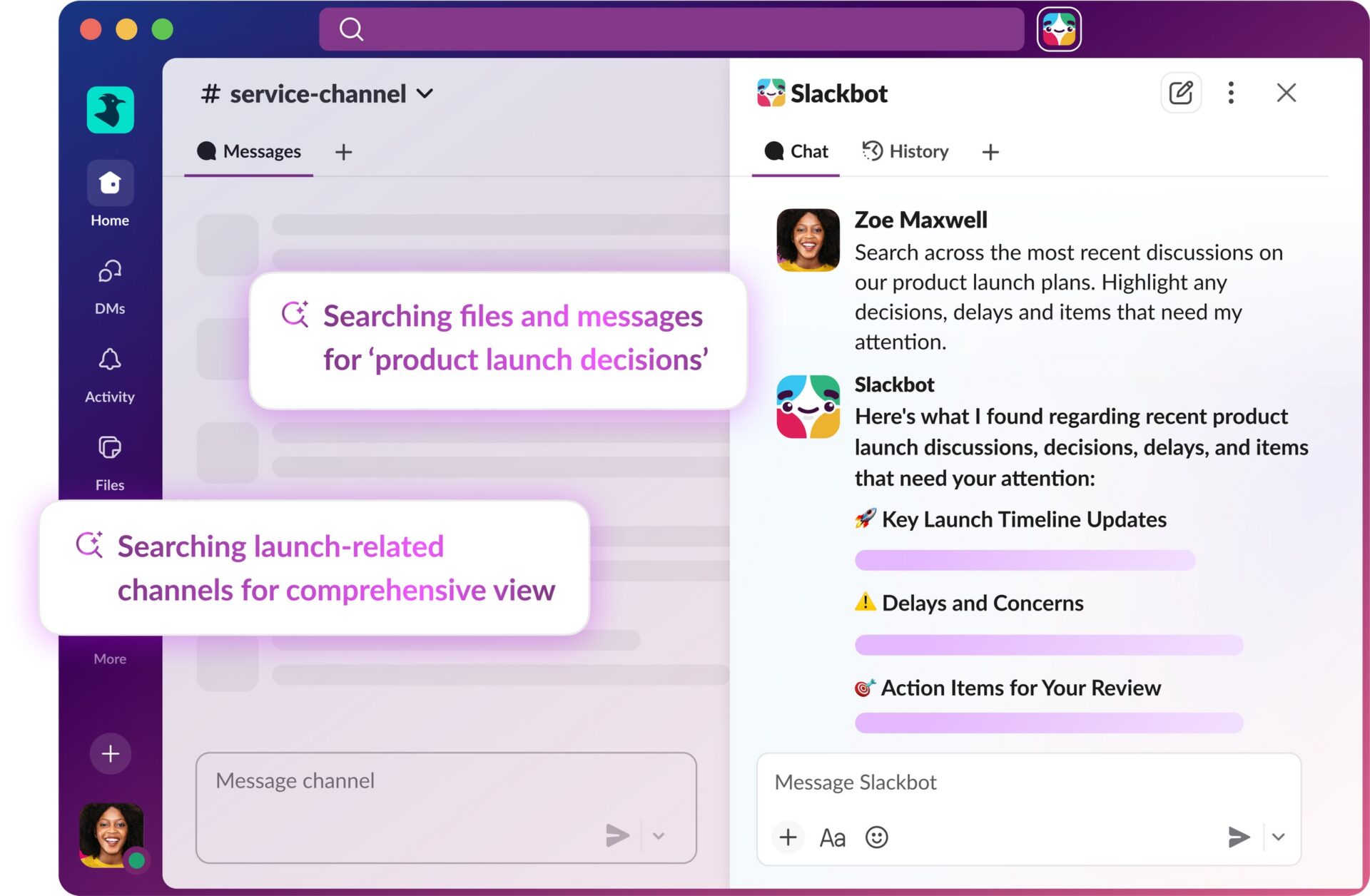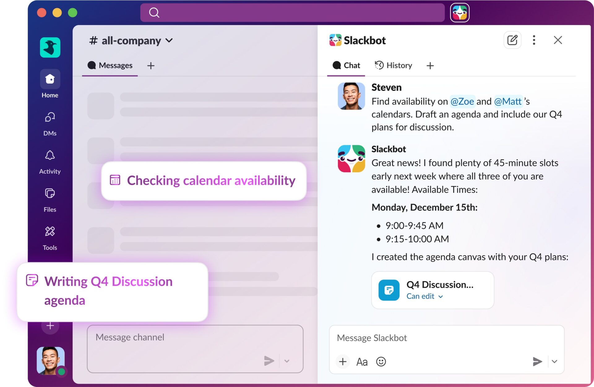 The Slackbot is able to help answer questions like “Where is that important file someone sent me?” or “What did we decide about the Q4 budget?” or respond to “Catch me up on Project Phoenix.”