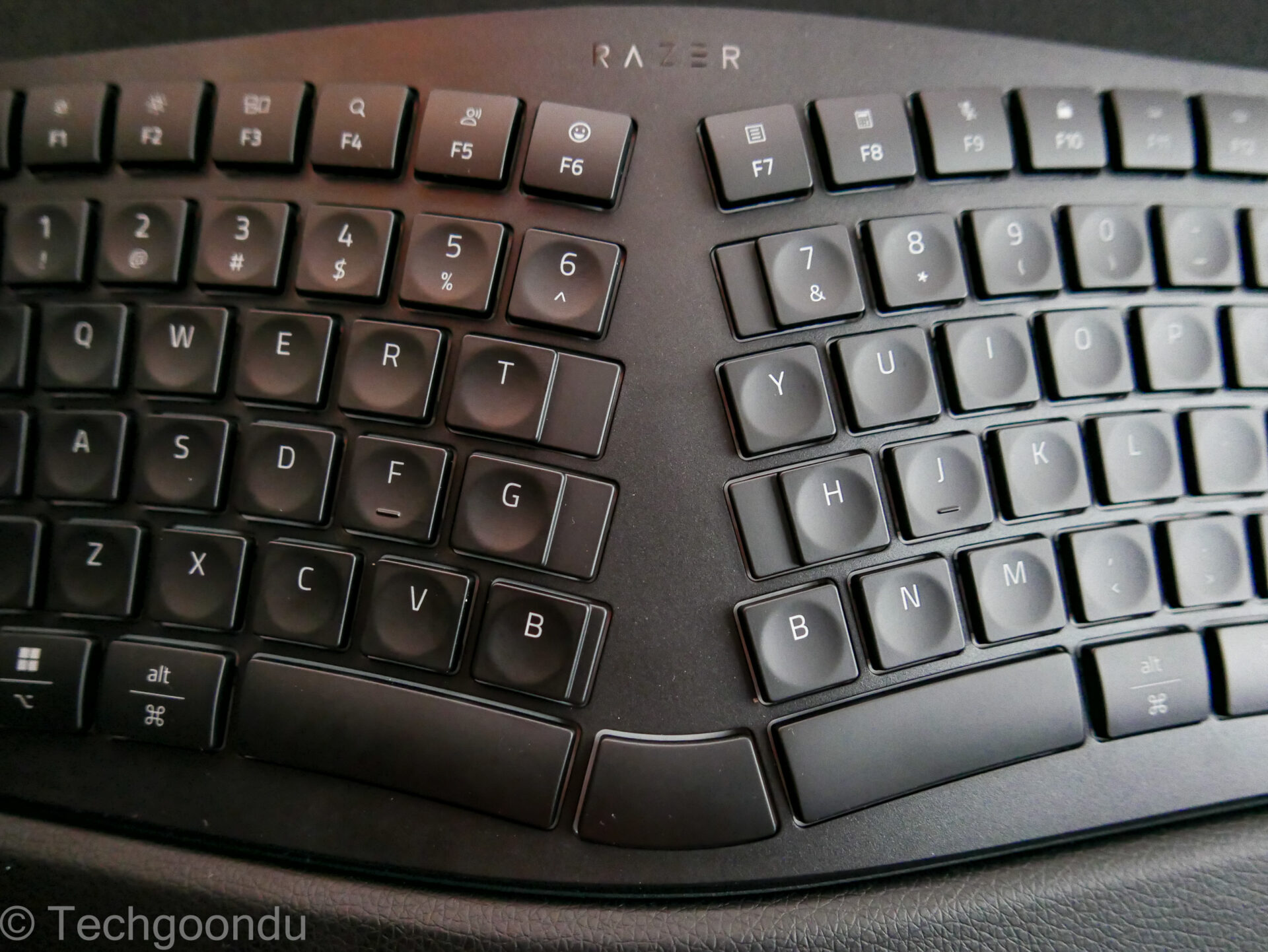 That’s because the Microsoft keyboard has elongated keys near the split – the T, G, H and N – while the Razer keyboard retains a standard size for its letter keys.